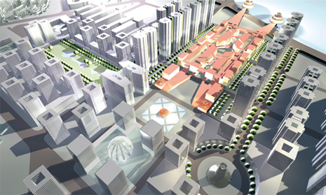 A new city with two main access connecting to the river, central park, residential and office buildings, malls